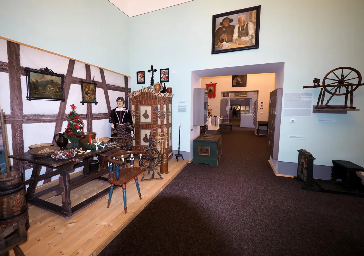 The first part of the exhibition introduces the history of the region, the next part presents important industries for the region, such as the production of porcelain, glass (beverage bottles), musical instruments and, of course, mining. The conclusion is dedicated to the Nostitz family, the owners of the castle from 1622 to 1945.